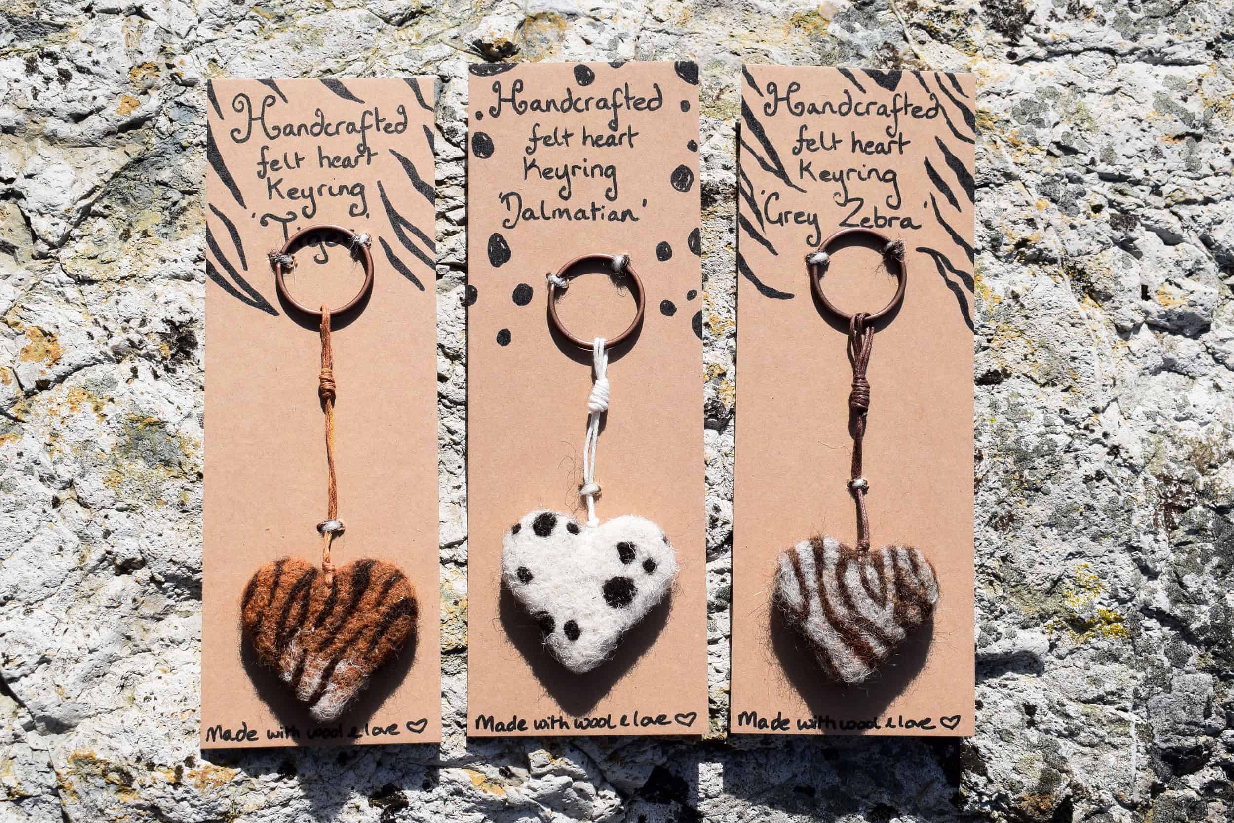 These heart-shaped animal print felt keyrings are handmade from 100% wool from my flock. The wool is all hand-dyed or its natural colour, blended together and needle felted into the shape of a heart and then threaded through a length of strong waxed jute and fastened to a rustic colour keyring. Some of these keyrings are highly detailed and feature animal pattern designs. They are really lovely lightweight keyrings, not heavy or clunky. They will make sweet little gifts and practical keyrings and each sale directly supports my woolly flock.