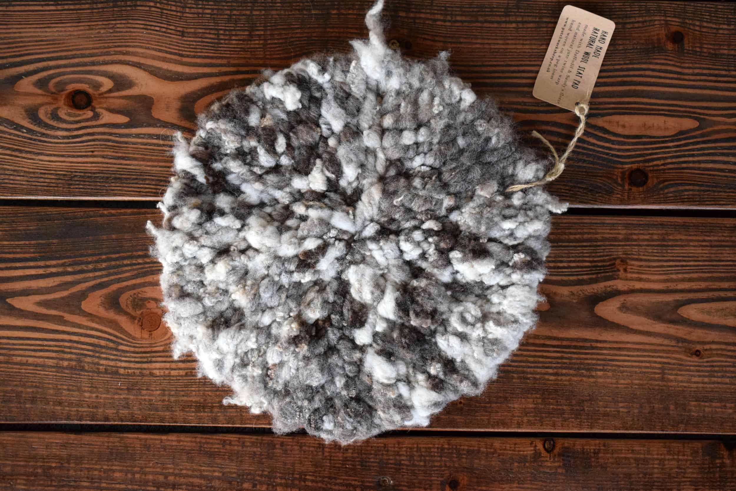 Handwoven circular peg loom wool seat cover made from Sandy’s fleece…