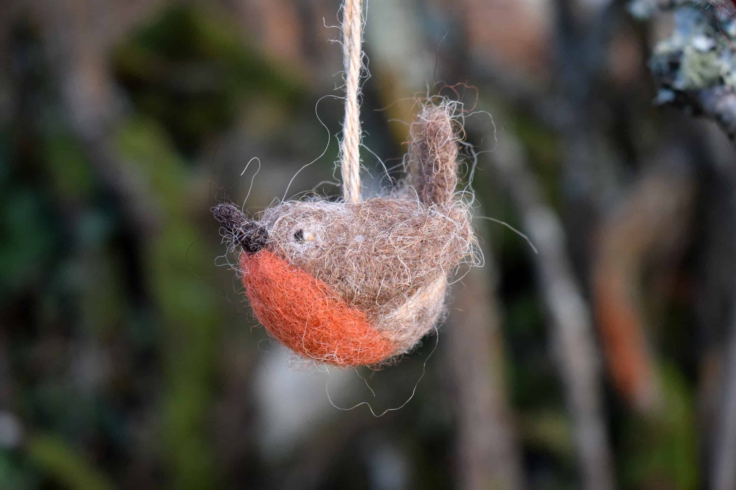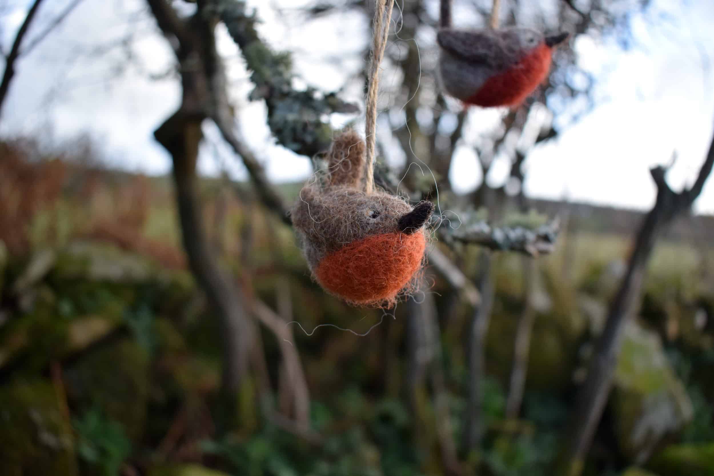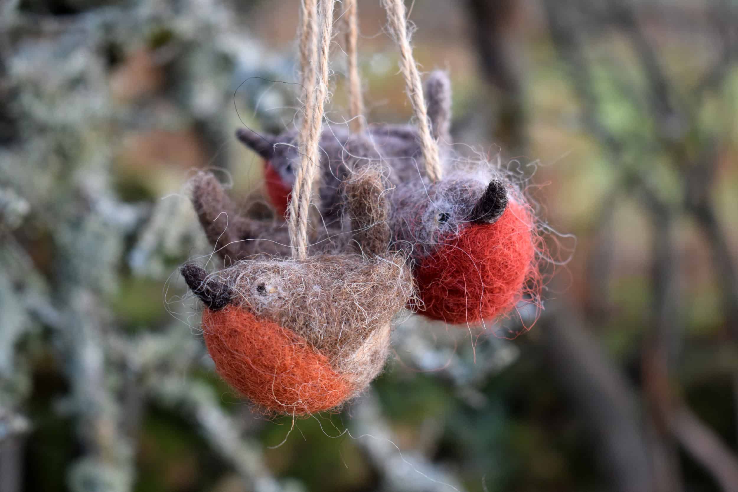 Cute robin baubles lovingly handmade from needle felted wool. These round little robins are looking for a new home to cosy up in this winter. They would feel very at home upon a Christmas tree over the festive season. Each robin is made from needle felted wool from my flock of sheep and is presented in a simple card gift box – a perfect present for someone or perhaps for yourself! Made from just wool and jute they are completely natural, biodegradable, kind to sheep and the planet.