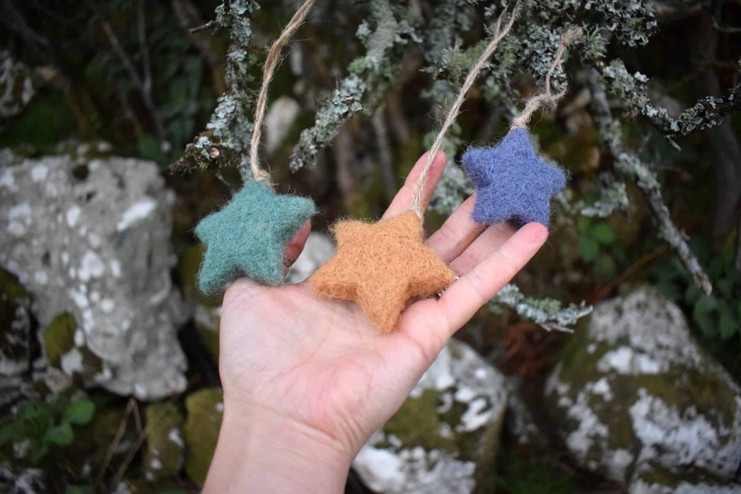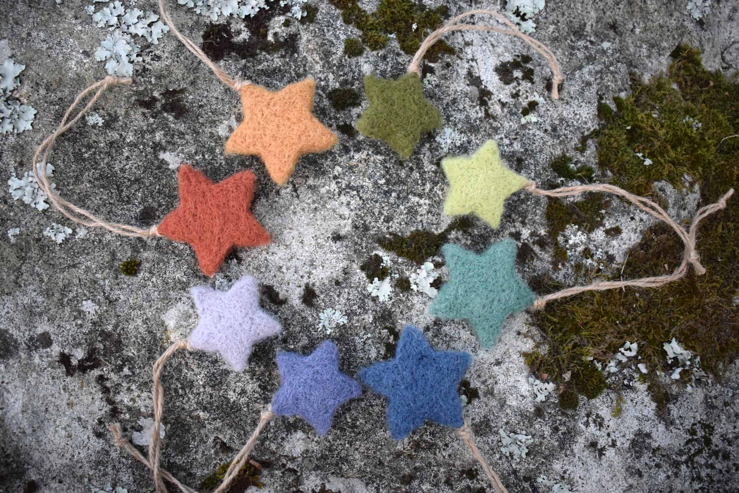 A set of 8 felted wool star decorations hand-crafted with sheep’s wool and a sprinkle of magical dye! Inspired by mage’s and wizards alike! The wool is from a sheep called Mango. To create coloured wool some of Mango’s white fleece was washed and then popped in a large bubbling pan, a little magic dye and plants were added and ‘poof’ her fleece turned into all the colours of the rainbow! Perfect for fashioning into stars, with witches and wizards and magic spells and potions swirling in my mind when I created them! These stars are perfect Halloween or Christmas decorations and make a lovely gift. Any mage’s or budding witches & wizards out there might choose to display them year-round and make their home just that little bit more magical (I know I would!). They are completely natural, ethical, kind to sheep and the planet.