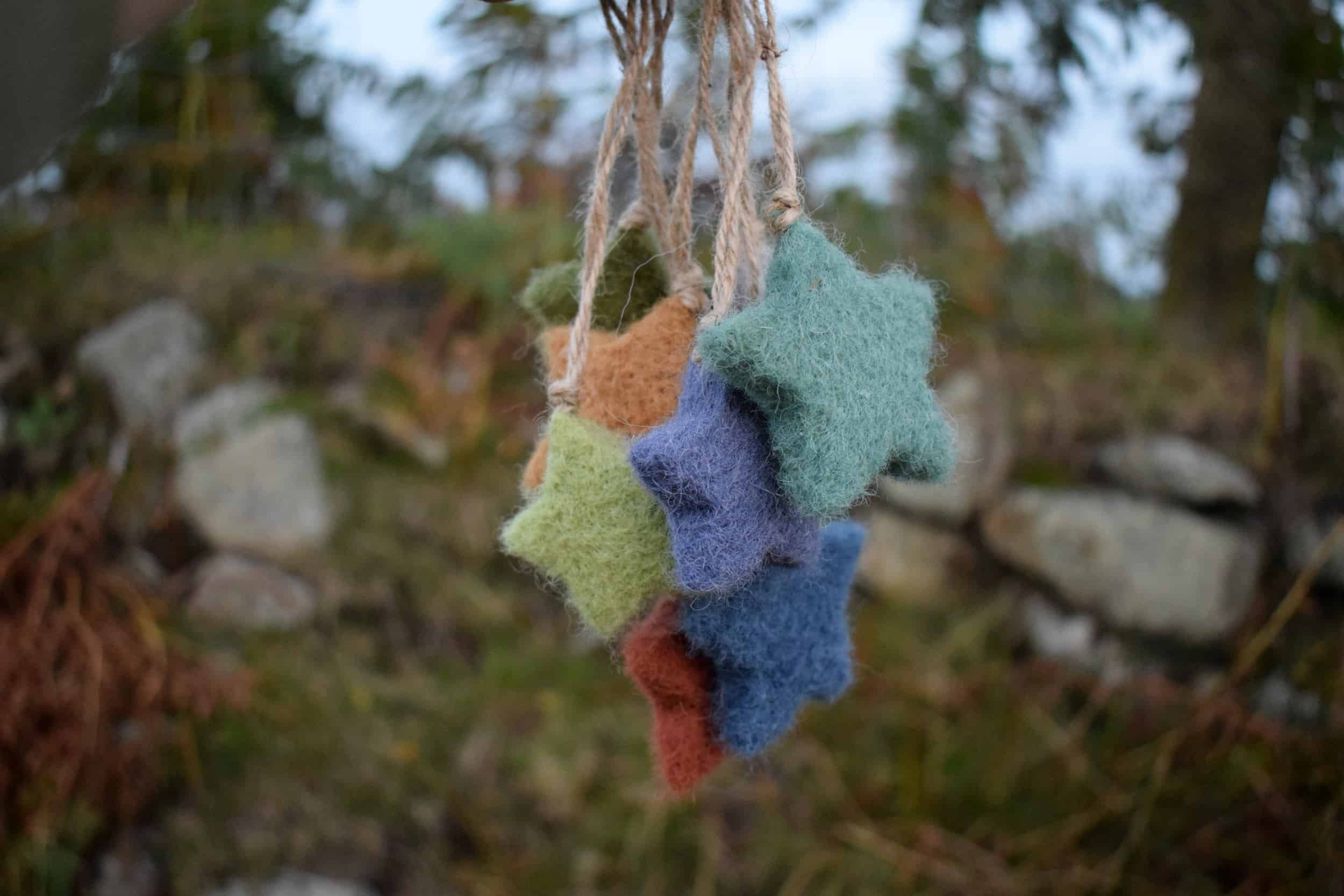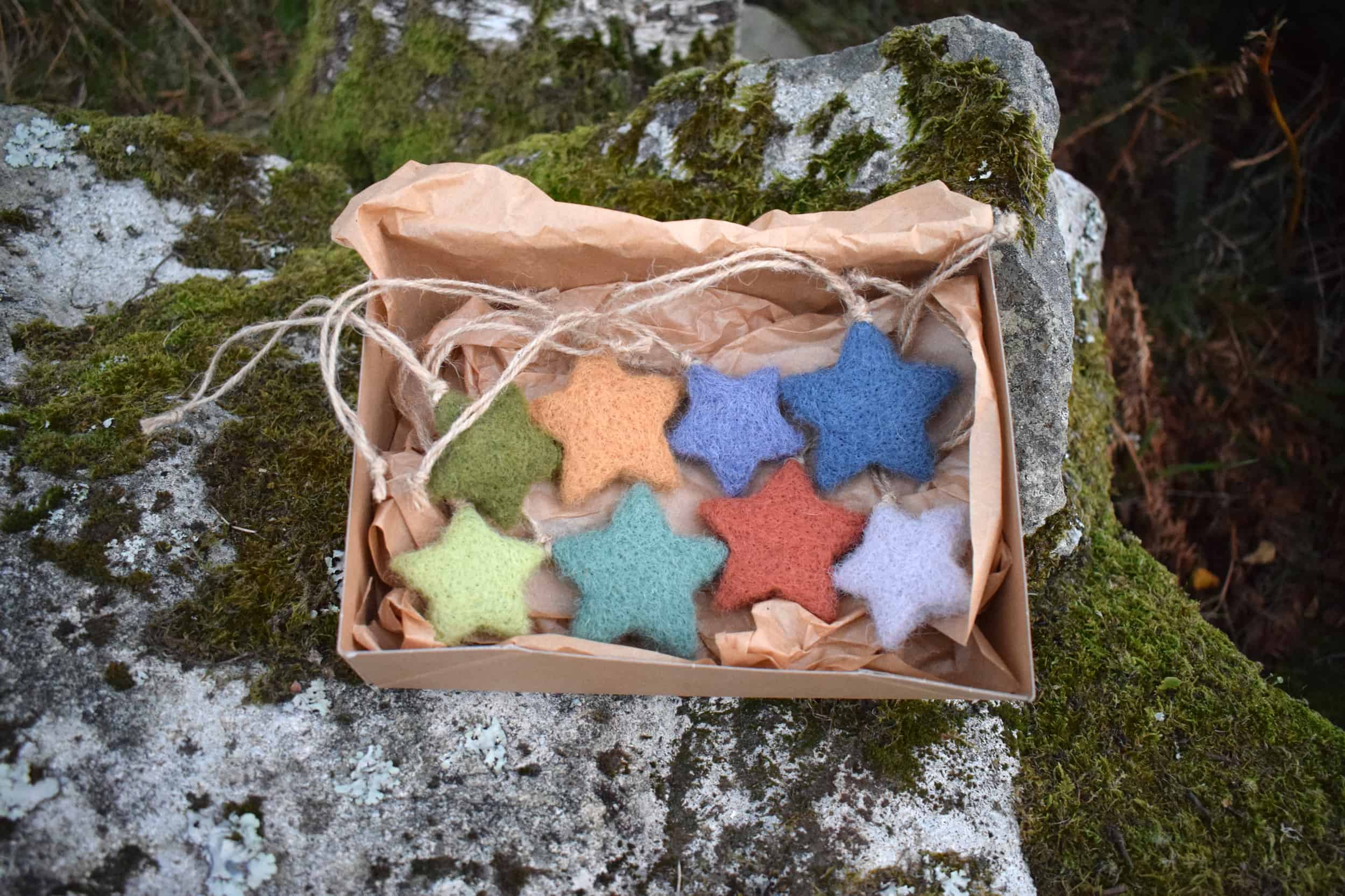 The only parts that are not wool from my flock are the jute twine that the stars hang from and the gift packaging.