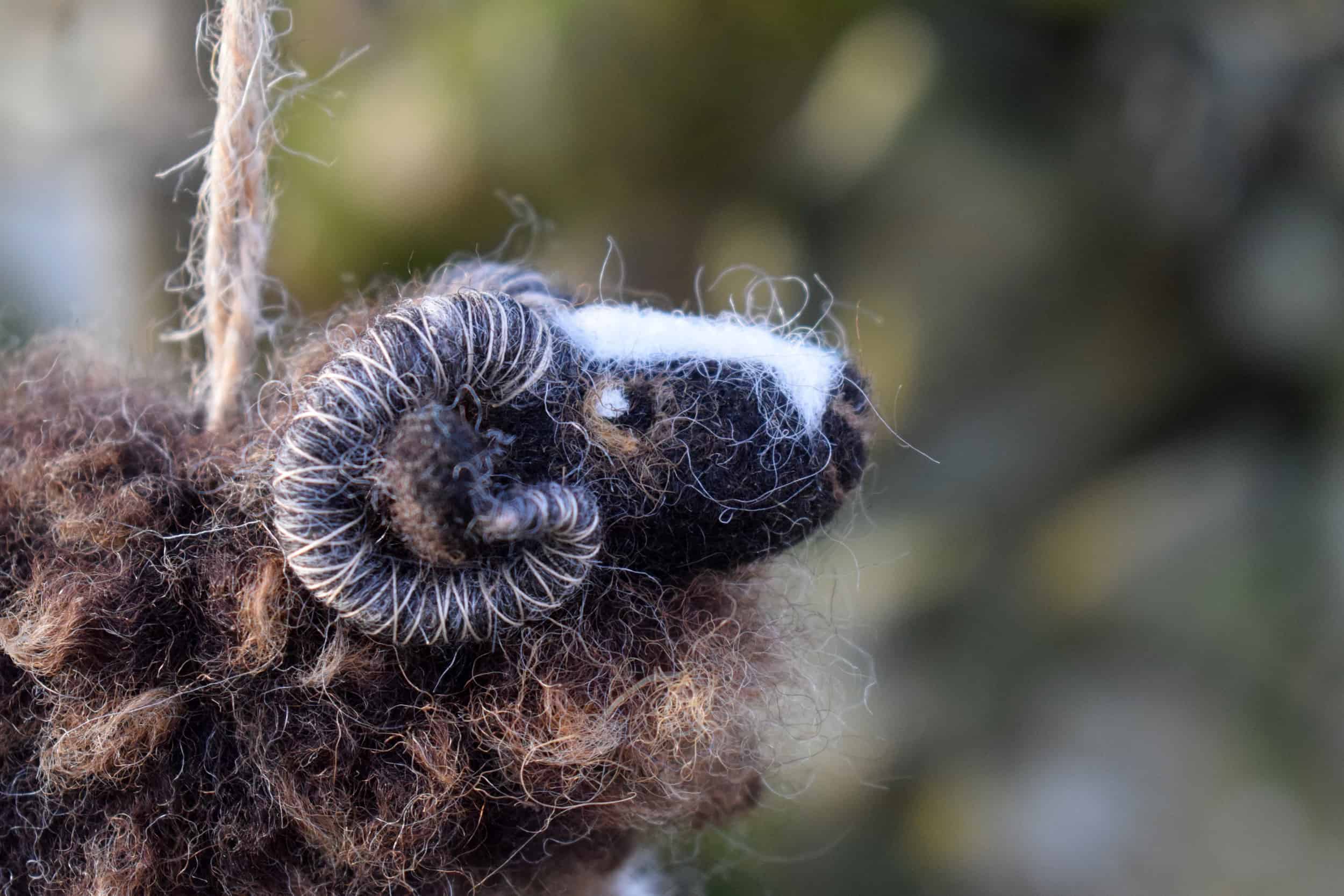 A handsome Balwen ram decoration. This little Balwen sheep is made by a process called needle felting. He is made from 100% natural wool with handspun wool dangly legs, poseable horns and a gorgeous fluffy fleece. He hangs from a length of natural jute twine and his horns are made from copper wire that is wrapped in wool and cotton. A perfect gift for anyone who is a fan of the Balwen breed or just loves sheep! The wool used in his creation all comes from my own flock from a few different sheep. His fluffy fleece is made from the darker neck wool from one of my favourites – Xena who you can see in the photos. I shear all our sheep myself with traditional blade shears and all the fleeces are processed by my hand here at our home.