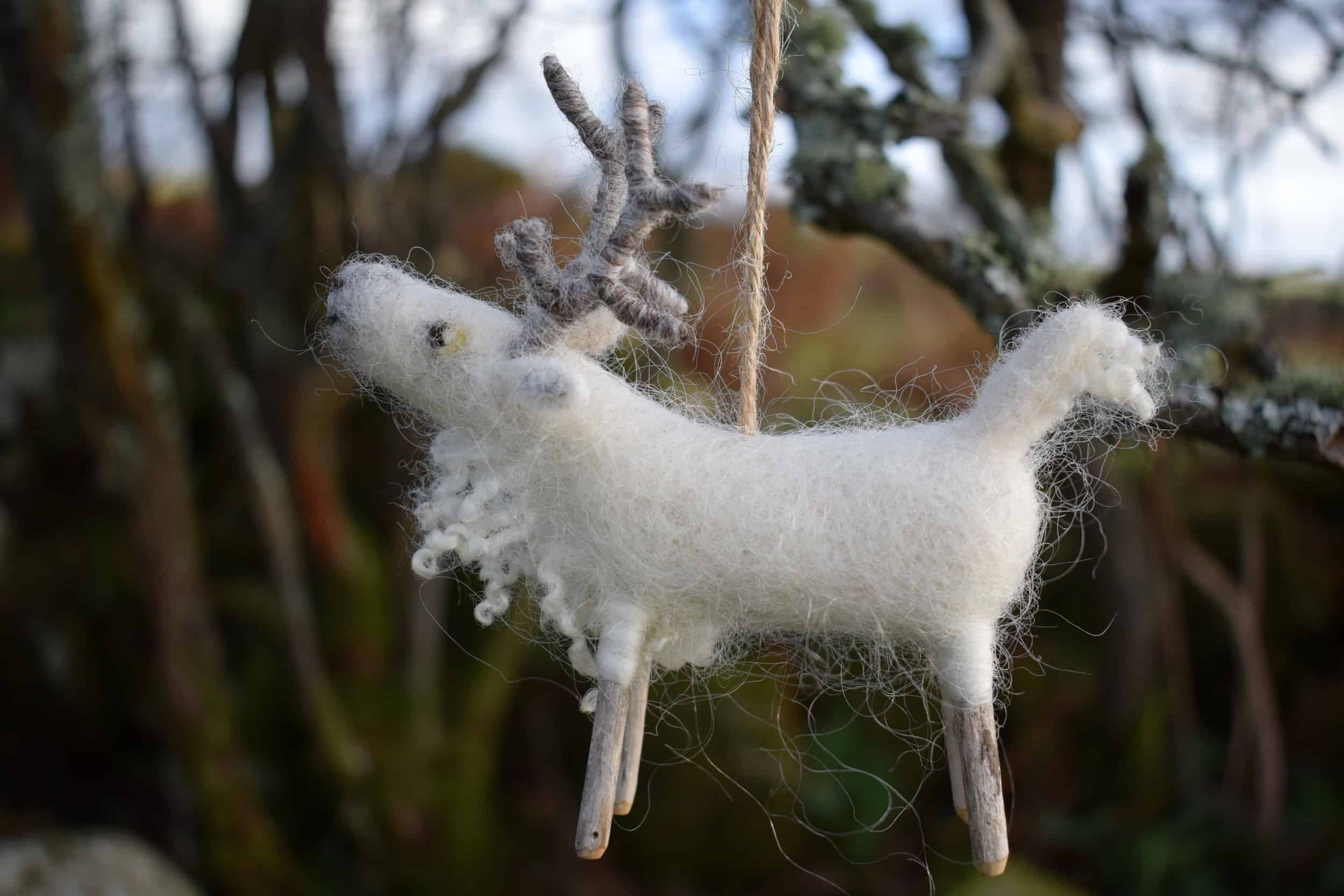 The little deer is made from all-natural wool, the only parts which are not wool from my flock are the jute twine that he hangs from, his little wooden legs and wire in his antlers. The main wool used in his creation comes from a sheep called Alice who has beautiful shiny white wool which I often use for creating Unicorns and sometimes reindeer like this little fellow.