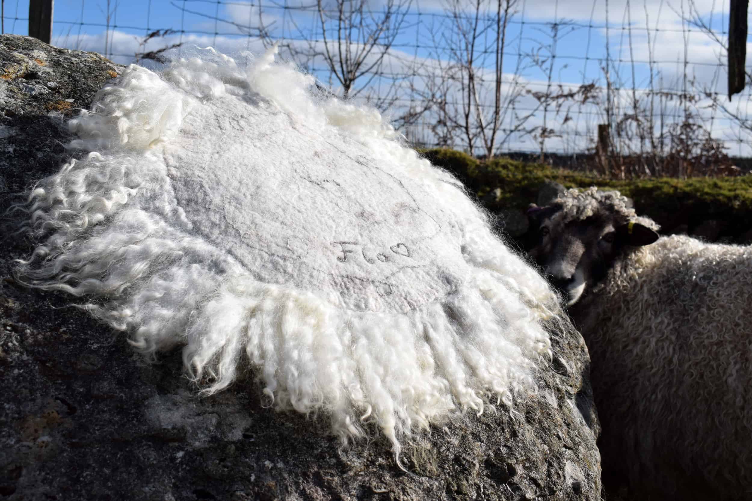 This luxurious large seat pad has been made using part of Florence’s 2022 fleece. It is pretty cream and light grey in colour and the gorgeous long curly locks have a natural shine to them. This has been made by carefully placing each individual lock from Flo’s fleece in a circular shape and then felted by hand. The felt underside is thick, soft and smooth and with handspun wool detail and Florence’s (shortened) name needle felted on as a special touch. The felt is made from carded wool from other sheep – Tawny, Mochi, Campion and Clover. This is a completely handmade product every element has been created by myself and Florence and the flock at our farm in Wales. The sale of it directly sustains the sheep and enables them to live happy lives here munching away growing beautiful wool.