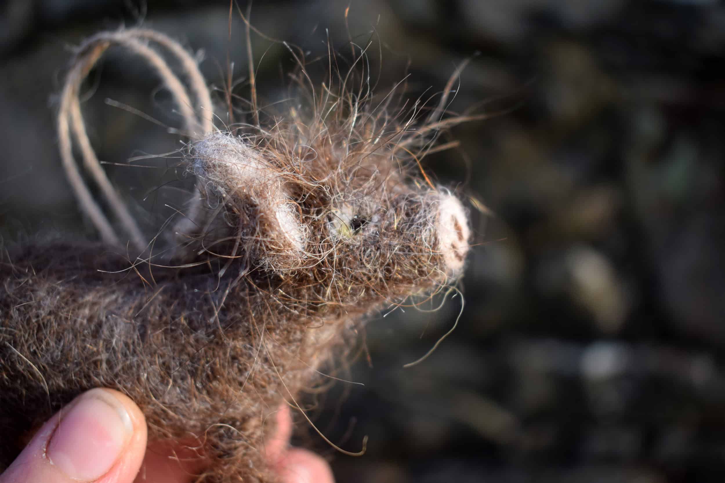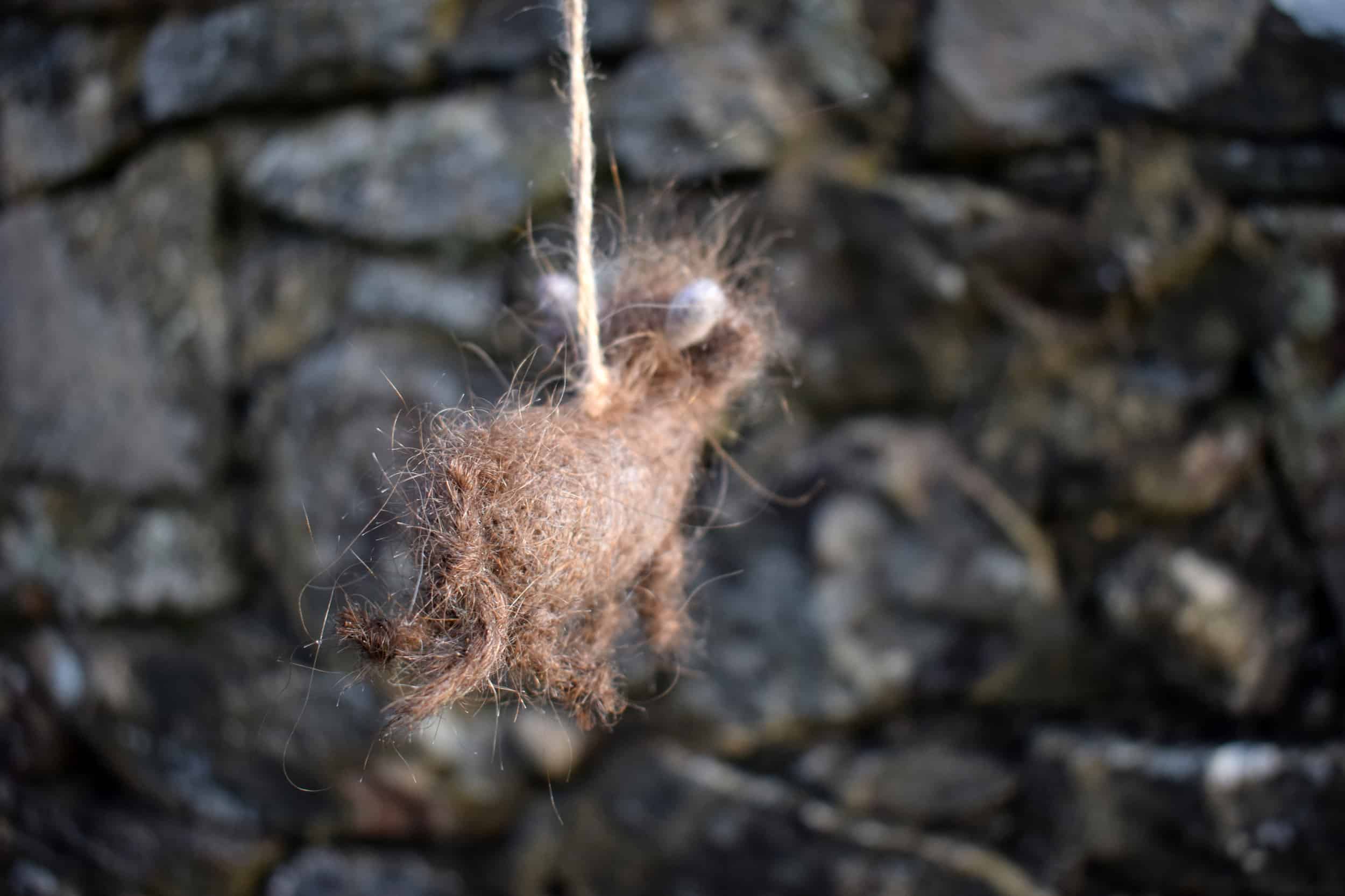 This cute little needle felted Dun Highland cow is made from 100% wool and real natural dun Highland cow hair handcrafted from sheep (and cow) to finish. Her eyes are pure wool and her tail and legs are made from carefully handspun Highland cow hair – she is made entirely at our farm by my own hands. The perfect addition to any cow lover’s home she looks very sweet hanging from a shelf especially in a cottage or farmhouse setting and would make a lovely unique gift. Completely natural, biodegradable, kind to sheep (and cow) and the planet. She is made with a little bit of wool from our sheep mixed with and some very hairy Highland cow hair from a pet cow who lives on Anglesey. The main part of her body is a mix of said dun Highland cow hair and a little beige brown wool from Marmalade. The Highland hair was gifted to me from Ema at The Clean Goat Soap Company. You can read a little more about it further below.