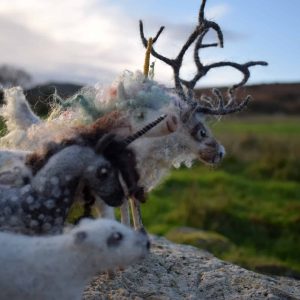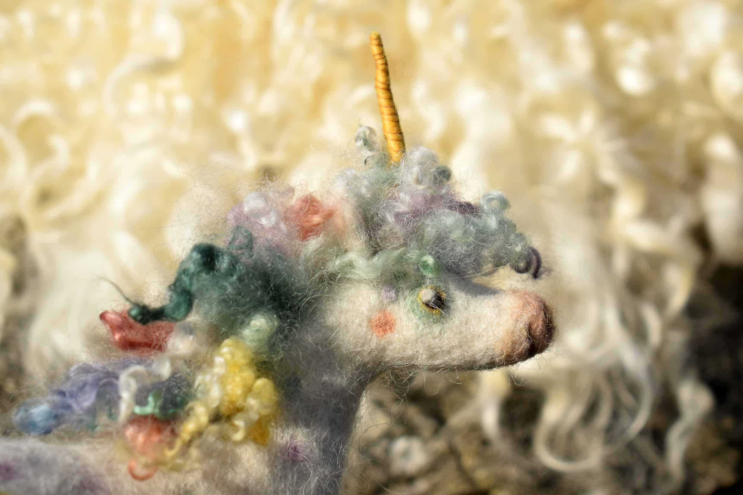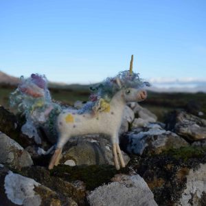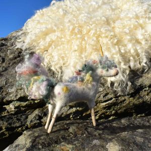 The process: Seren is made with a process called needle felting – the wool is shaped and sculptured and repeatedly stabbed with a special barbed needle causing it to felt. Sometimes wire is wrapped with the wool to make the finished item poseable as is the case with Seren’s horn, tail and neck. Seren’s body is made with wool from a sheep called Harley, you can see a photo of him on the gallery. The body is made from scratch with solid wool, there is no stuffing or frame beneath. Soft wool is carefully layered and shaped and repeatedly stabbed and sculptured until it felts into a hard solid body. Seren’t legs are made from driftwood foraged from Nant Gwythern beach. The are cut and sanded and inserted and glued into the body. The curly coloured wool used for the mane and tail comes from Norbert and Lily the sheep. These curls are felted into the neck for the mane and around a wire for the tail. The little details such as the stars on Seren’s body are felted on by hand at the end. To create coloured wool white fleeces were carefully washed and then popped in a large bubbling pan, a little magic dye was added, given a good stir and ‘poof’ the white wool is transformed!