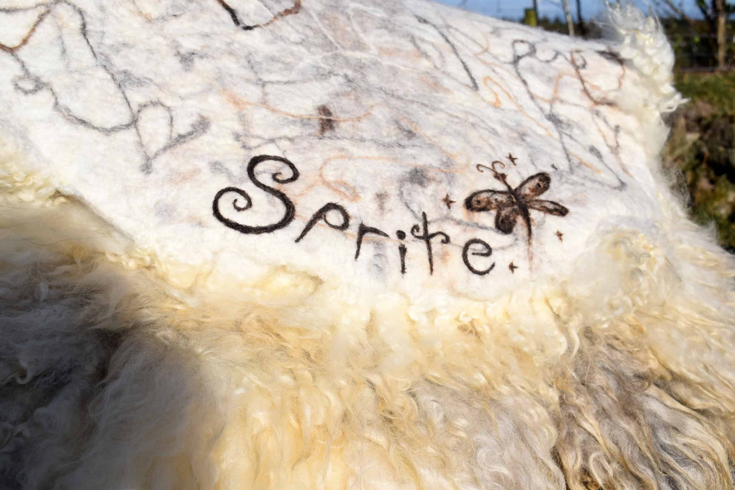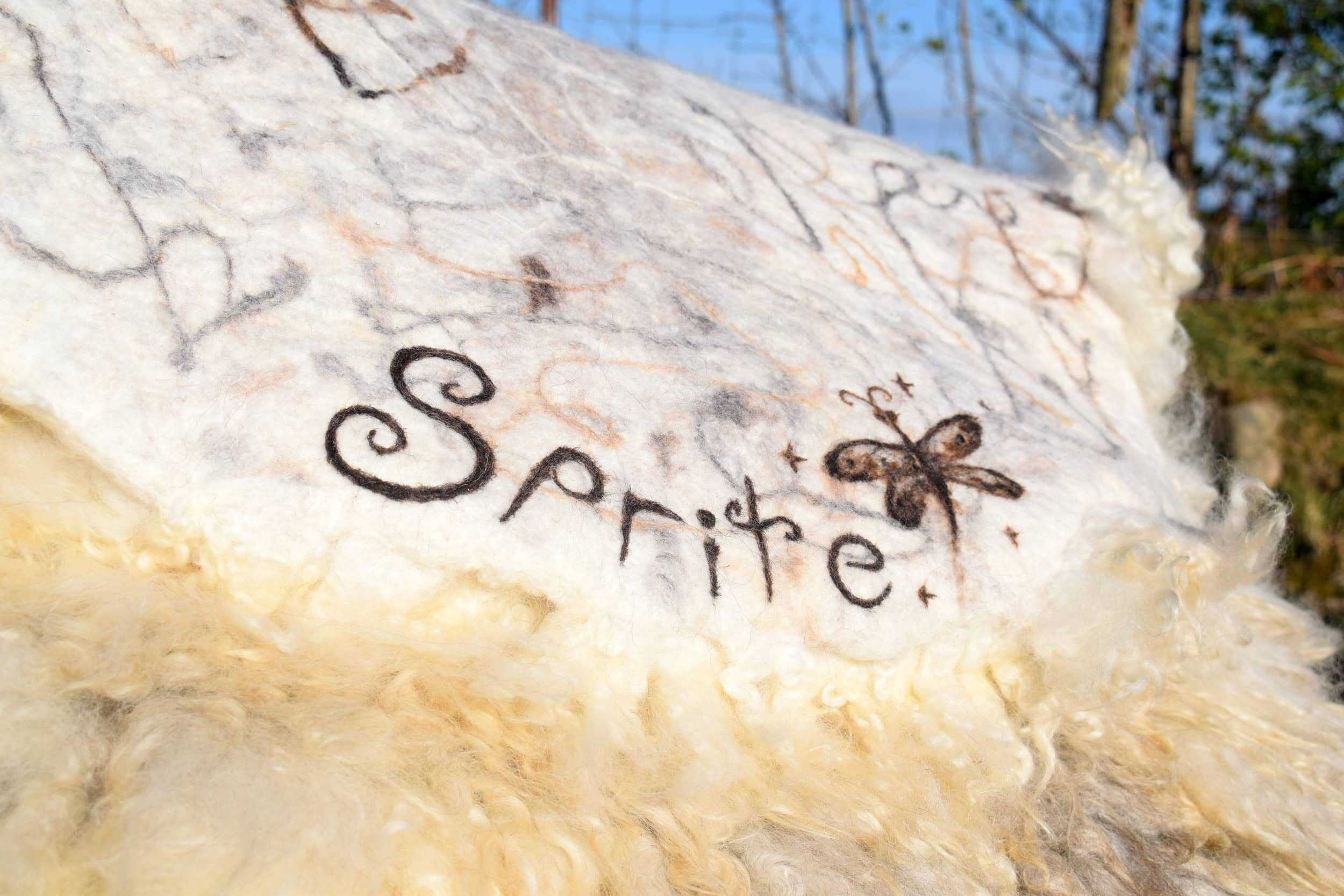 Made with the fleece of a teeny tiny sheep called Sprite who is a Gotland cross Shetland/Leicester Longwool sheep. This beautiful felted sheepskin fleece is very pretty and soft and very versatile. It is a very good example of a felted fleece rug. Made with the whole of Sprite’s fleece in the natural shape. A good even size with thick warm felt on the underside. The felt features a unique pretty design created from handspun wool yarn that colplements Sprite’s pretty fleece and features her name needle felted into the felt.