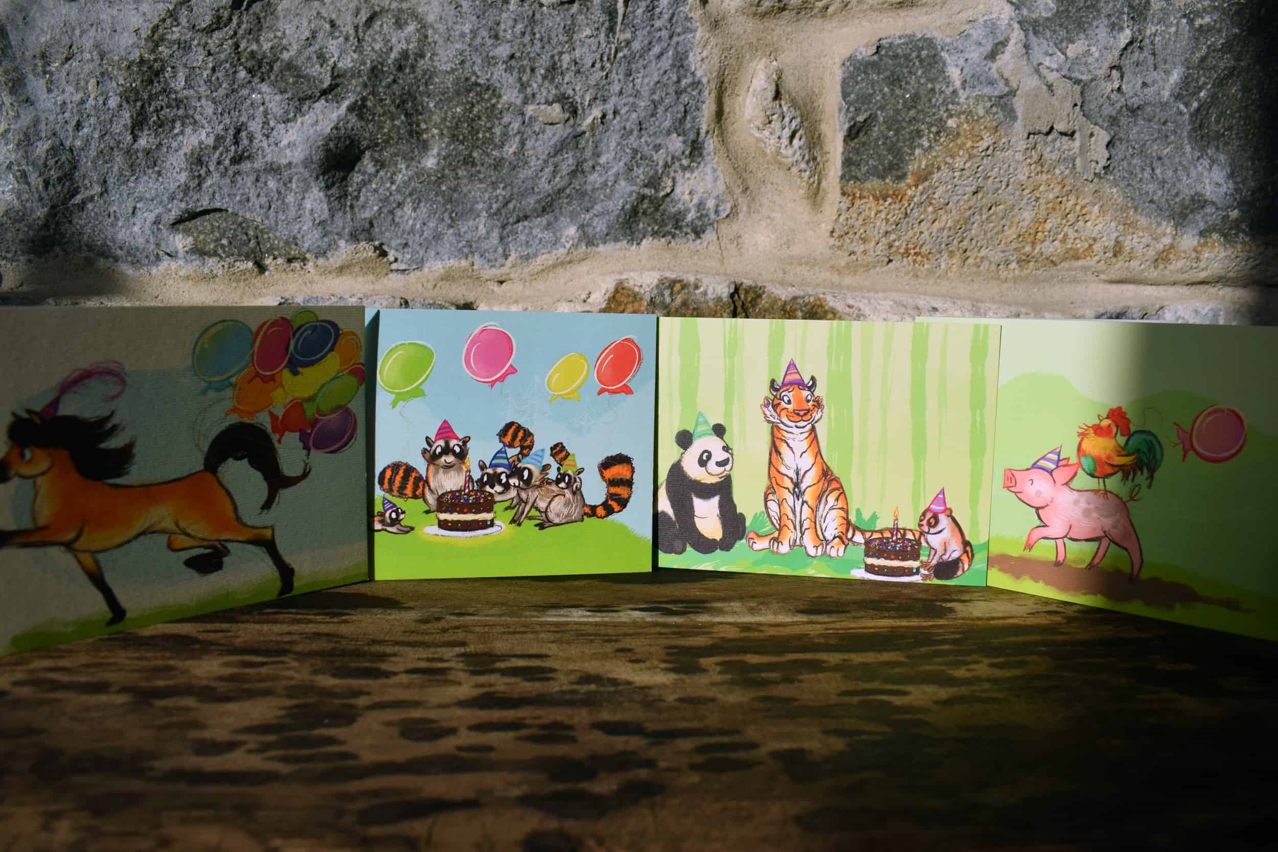 Cute Birthday cards set featuring colourful fun animals drawn by my own hands…