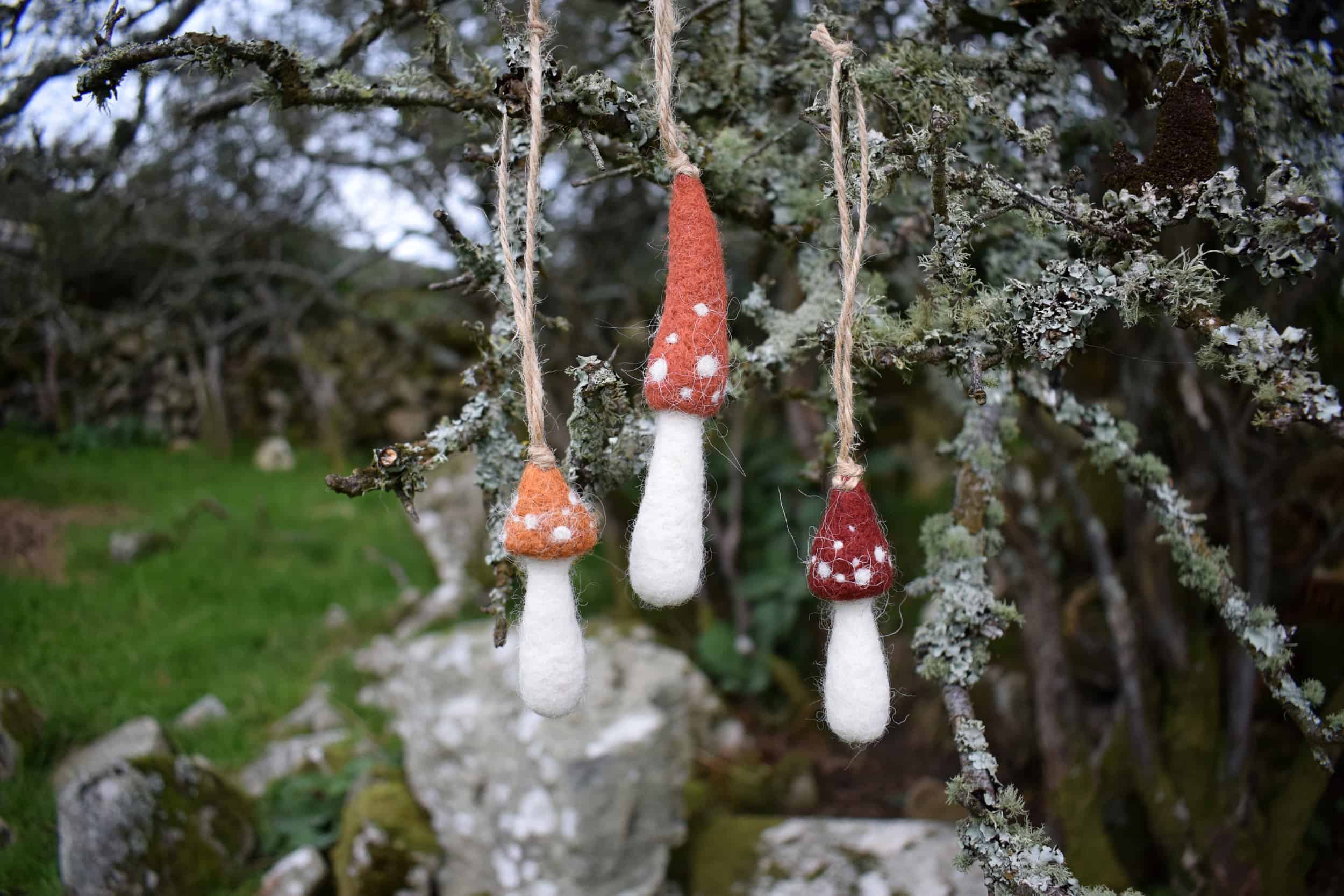 A trio of magical fairy mushrooms from Wales. Hand-crafted from sheep’s wool and magic! These felted fairy mushroom decorations are perfect to brighten up your home in the Autumn and Christmas season. I personally love them as Christmas tree decorations. This trio of dainty mushrooms is presented in a little gift box so they would make a special little gift for mushroom lovers and aspiring witches and wizards out there. The wool used to create these magical mushrooms comes from Mango and Mint. The Autumnal colours were created by adding some of Mango’s white fleece to a bubbling pan of Madder roots! And then a sprinkling of magical acid dyes were added to create different variations of colour. Mango also grew the wool for the mushroom stems. Mint’s job was to provide the hairy white fluff for the little white spots on the mushrooms – the finishing touch!