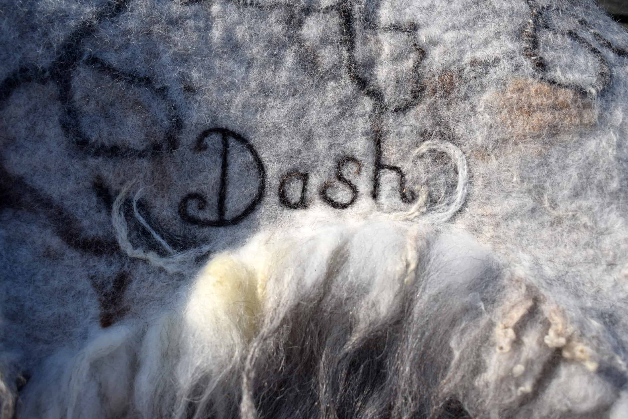 The reverse of the rug is made from carded wool that is then hand felted to Dash’s fleece. That felted wool is a mix of wool from some of my other sheep – Mochi, Daffodil Frieda. The underside is decorated with some handspun wool and wool locks making this rug even more unique and extra special. I have also needle felted Dash’s name on there.