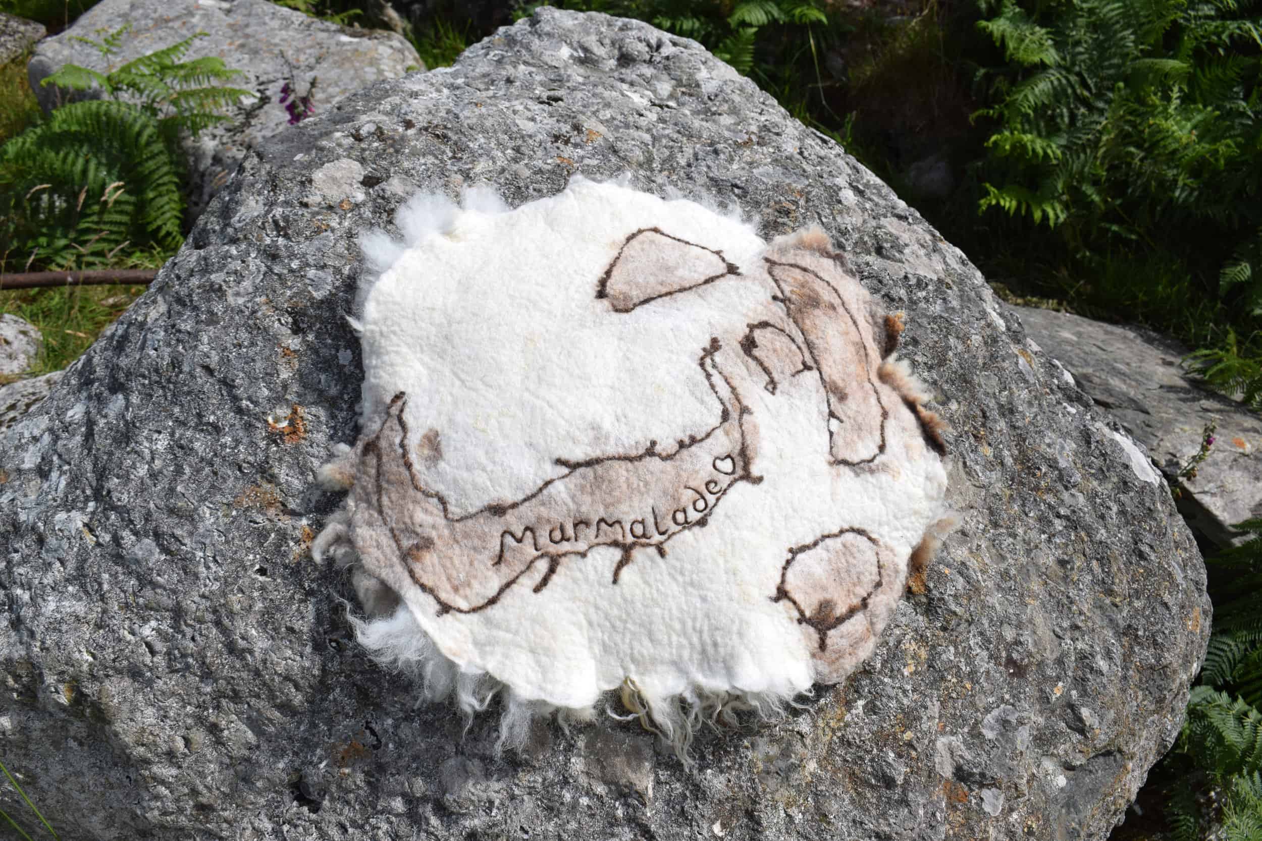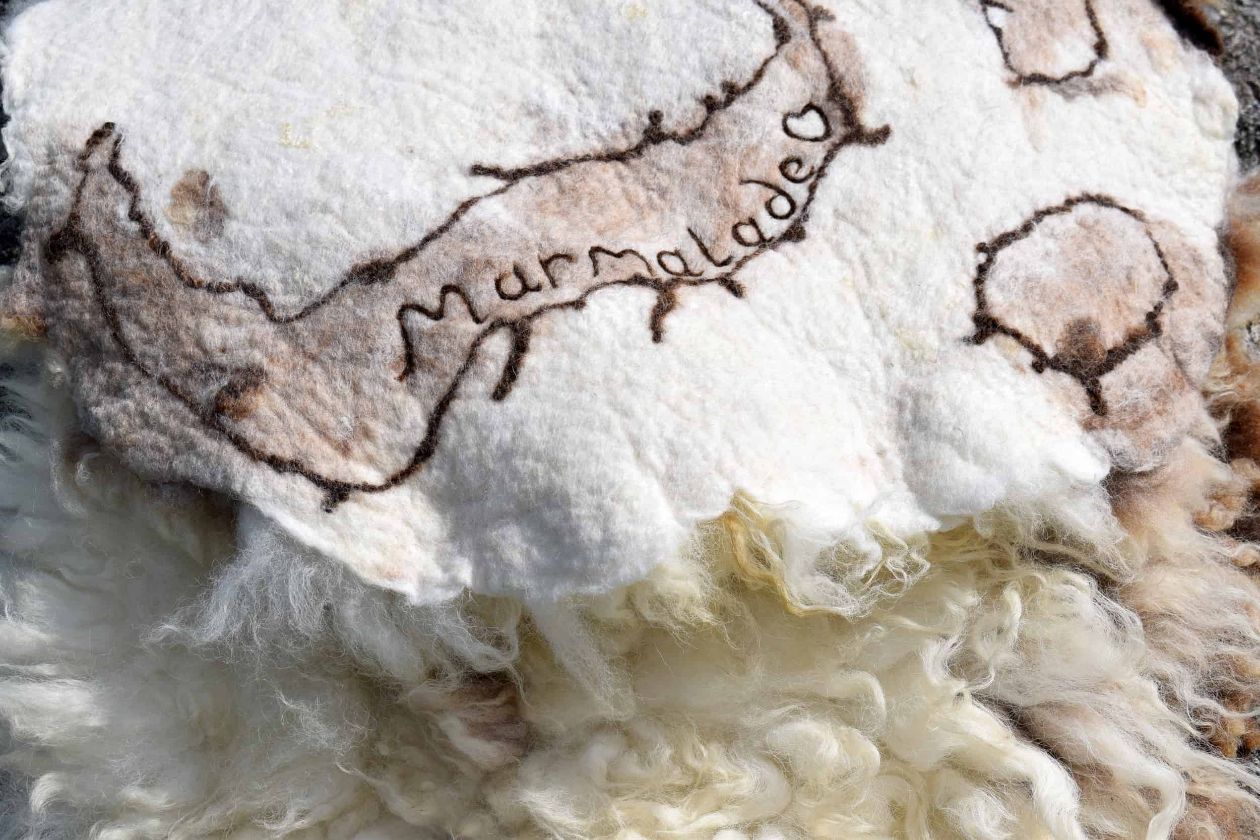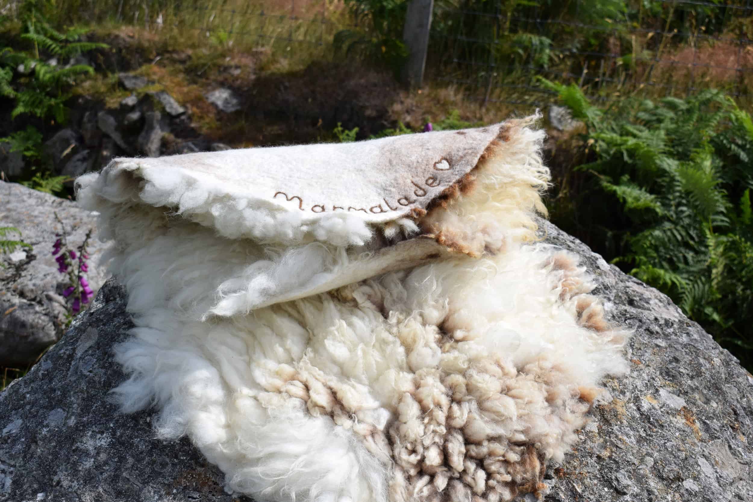 This beautiful all wool felted fleece has been made using part of Marmalade’s 2021 fleece. It is medium-soft to touch and has an incredibly pretty wool structure and natural colours. Marmalade is what is called a ‘moorit-spotted’ colour in simple terms – a light brown and white spotty sheep. The felted reverse has been created with a mix of wool from Marmalade herself and some of her friends – Muffin, Rupert and Lily. The reverse is very smooth and well felted. With this seat cover, I experimented with the pattern on the felt on the underside using some of my handspun wool and I have needle felted Marmalade’s name on there too – so you’ll never forget who provided this beautiful fleece. This is a completely handmade product every element has been created by myself and Marmalade and the flock at our farm in Wales. The sale of it directly sustains the sheep and enables them to live out their whole lives here munching away growing beautiful wool. You can’t get more ethical than that.