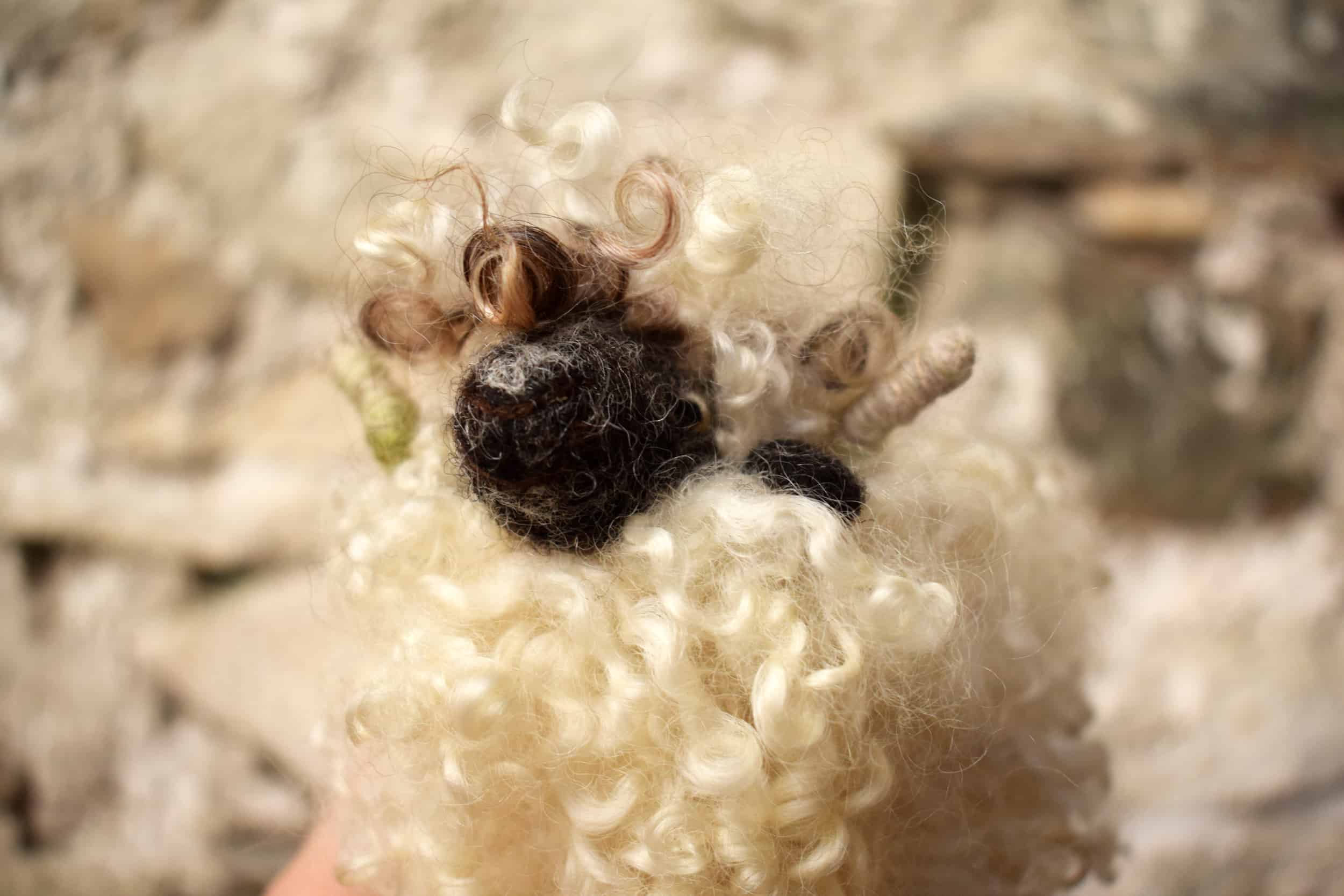 Beautiful miniature Valais Blacknose sheep. Made by hand from start to finish. The body is solid wool which has needle felted and once the desired shape is achieved natural wool locks are individually needle felted in to give this chap a wonderful dreamy curly coat. All his facial features and ears are very carefully needle felted in and handmade wooden legs that are made from wood gathered about the farm are then attached with wool and a tiny amount of glue. Lastly the wire based horns are threaded through and wrapped with wool. The horns can be gently bent to manipulate the shape. This little sheep is free standing and looks super on a shelf or mantle piece. He really is the perfect gift for any Valais Blacknose fan or sheep fan in general. The wool used comes from my own flock of sheep and is all natural colours except for a small amount of colour used in the horns and eyes which has been handdyed. This particular Valais sheep has been decorated with curly white/cream wool locks from our lovely Wensleydale sheep Hagrid who is also in the photos. The body base is made with wool from another of the flock – Xena.