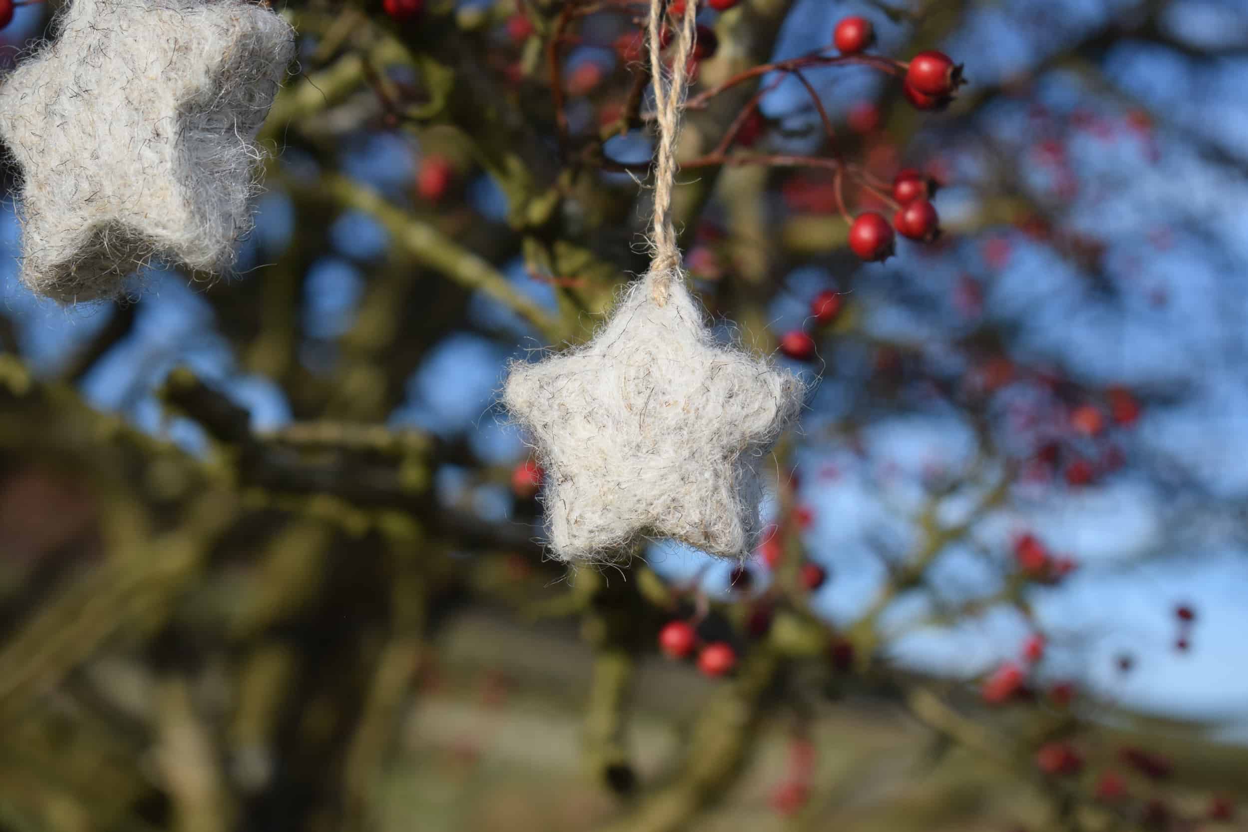 These little stars are each individually handmade so no two will ever be the same. This listing is for the exact set of 8 stars pictured. They are 100% natural coloured wool threaded on natural jute. The wool used comes from a local Torddu Welsh Badgerface sheep. The stars are very solidly felted and will last and last.