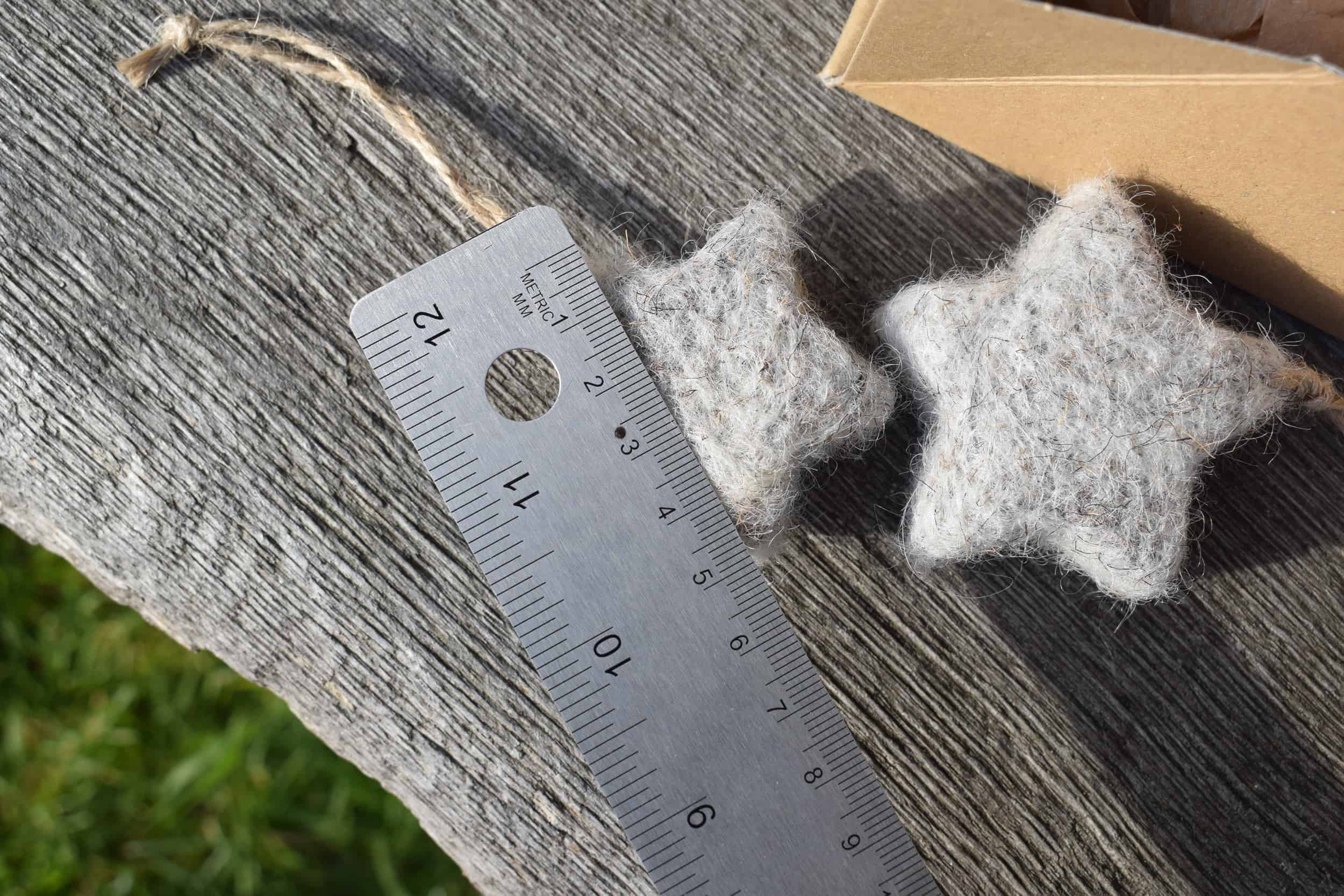 Measurements are approx small stars – 4.5cm large stars 5.5 cm give or take. As mentioned above, this is handmade and is not perfectly uniform like a factory produced item would be.. And unlike most factory produced items this is eco-friendly, biodegradable, traceable right back to the individual sheep who grew the wool and the sale of it will directly support my sheep flock and own family.