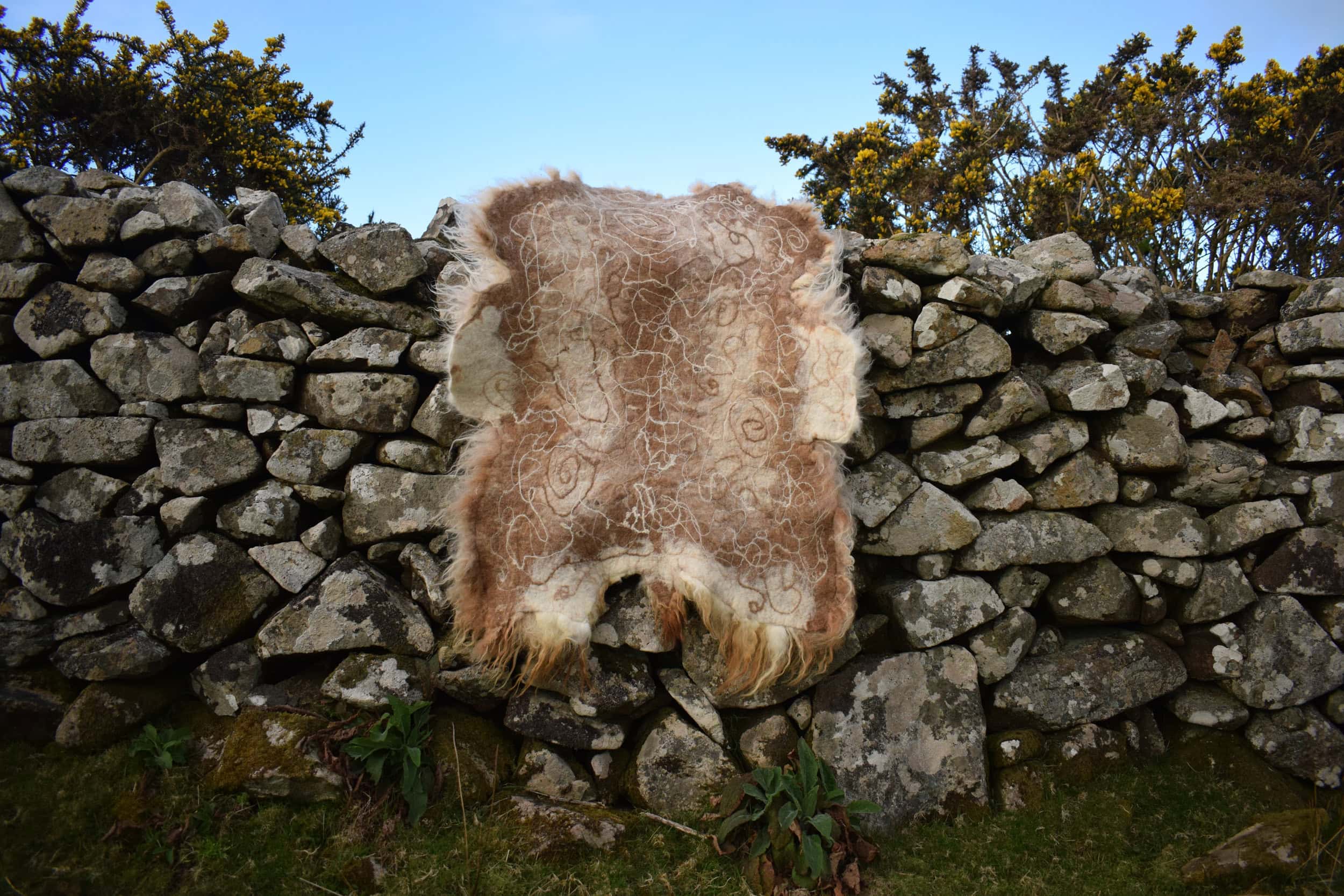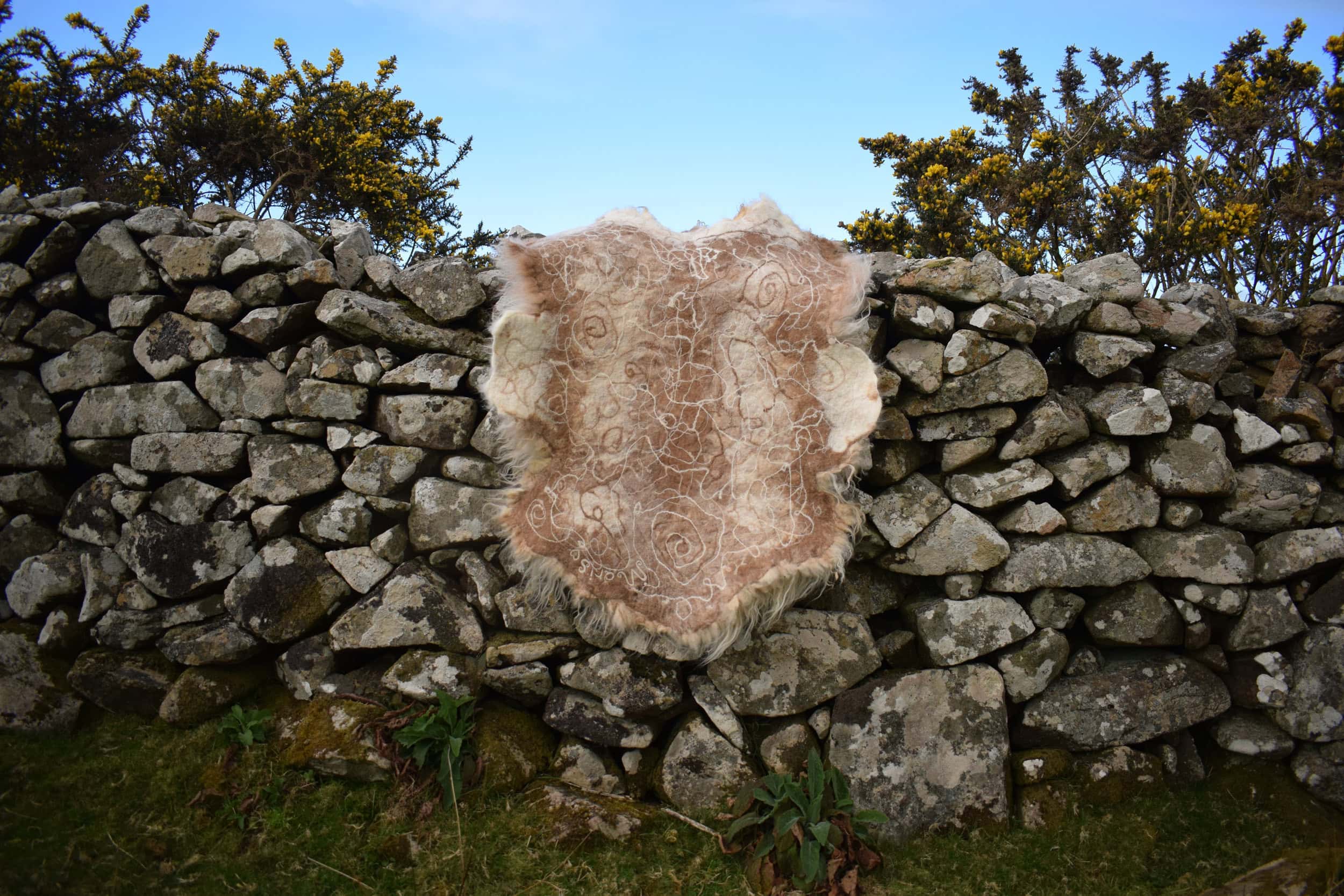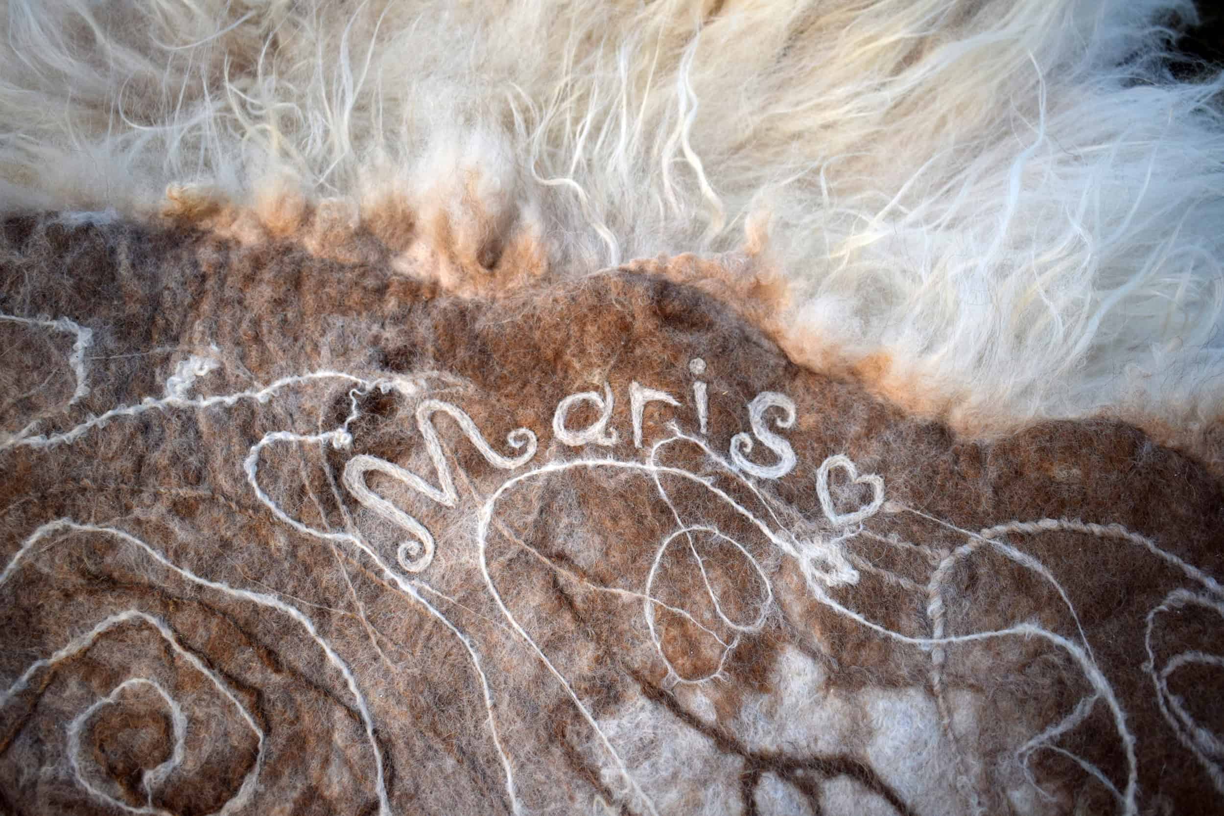 The rug: This Icelandic felted fleece rug is a very pretty cream and golden beige colour. Handcrafted using the whole of Maris’ fleece and backed with wool from other sheep in the flock. The fleece is a medium/light weight and the fleece itself is soft to touch. The rug itself is a medium size natural shape. The backing felt is wonderfully thick and features a unique design made from handspun yarn. This design is carefully created prior to felting so it becomes one with the fleece during the felting process. Maris’ name was needle felted on at the end as a finishing touch. The fleece itself is soft and light with shorter lightly brushed wool down the central spine and longer wilder, more hair like locks on the rear, edges and front of the fleece.