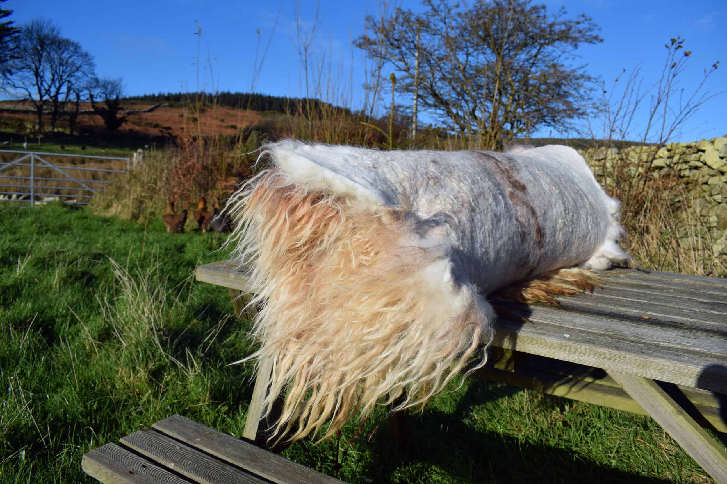 VM(aka hay/grass seeds etc): I spent a lot of time removing the most noticeable bits of debris Piper collected in her fleece throughout the year, bits dried leaves mostly where she has foraged in hedges in the winter months.. However, you may still find little bits of dried leaves and grass seeds as this is a natural unprocessed handmade piece.. I have also brushed out the center of Piper’s fleece to remove all the debris I could find but left the edges au natural to keep the beautiful structure and character of the fleece.