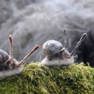 Each wee snail is made by a process called needle felting. Needle felting is a way of working and sculpting dry wool using special barbed needles. Repeated stabbing of the wool using these special needles causes the fibers to interlock and tangle and if you work it long enough you end up with a firm solid piece of felted wool. All my needle-felted items are very solidly felted with carefully added details. They are not flimsy soft needle felting they are worked until the felt is hard and firm. Crafted with a lot of love and care, never rushed and made properly they take a surprising amount of time to make and that’s not even including the time spent shearing the sheep, washing the wool, carding, dyeing or spinning the little tails! My needle-felted crafts are priced according to the amount of time spent making them.