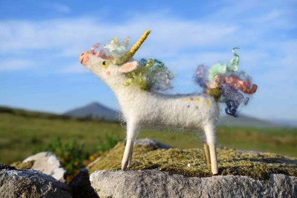All the unicorn’s facial features and ears are very carefully needle felted by hand, the made and tail are also attached by needle felting. Her wooden legs are made from driftwood gathered about from Criccieth and Nant Gwythern beaches the legs are attached with wool and a tiny amount of glue. The wire-based horn is threaded through and wrapped with wool. The horn can be gently bent to manipulate the shape. As can the tail which also contains a small wire.