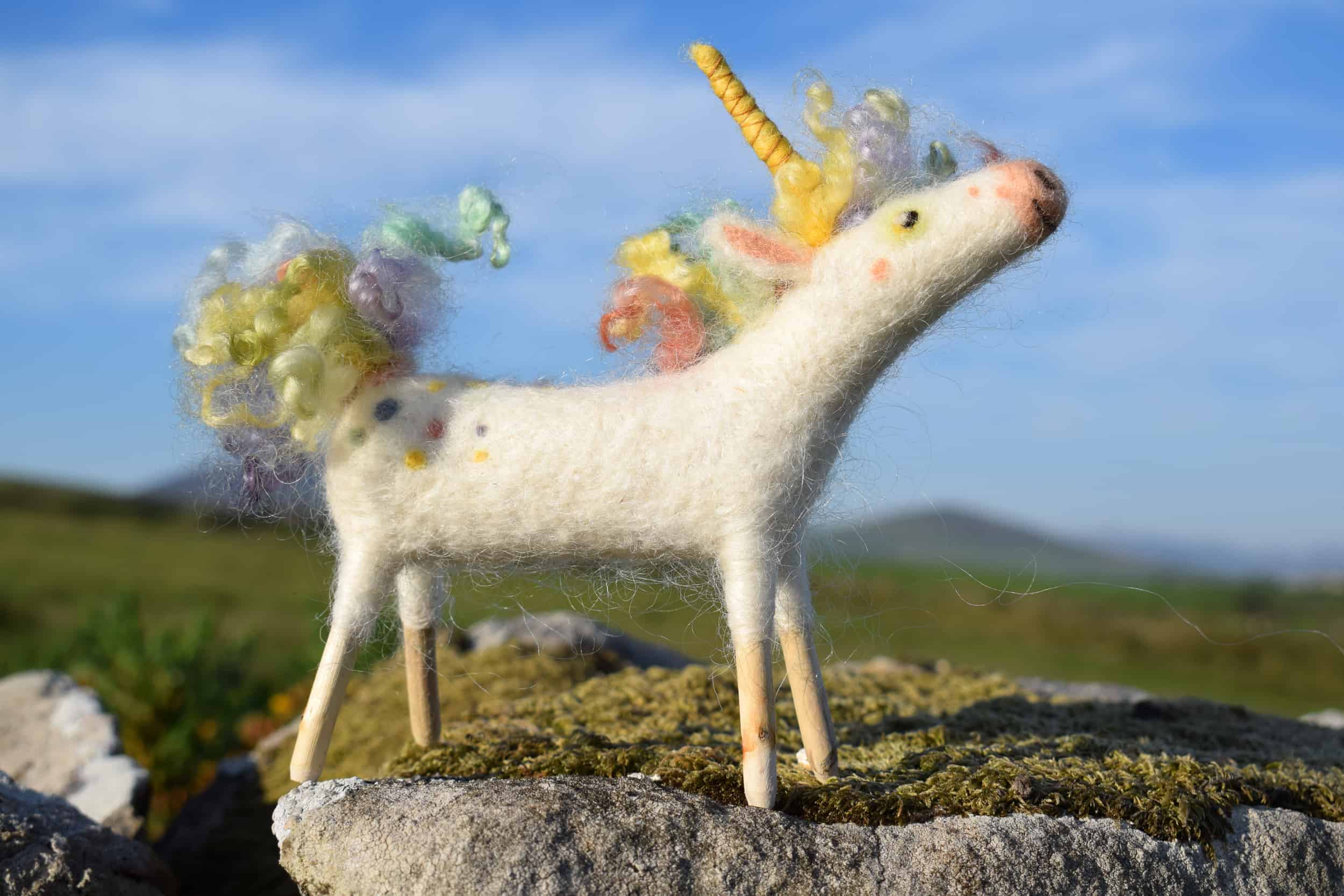 This Unicorn has been handmade with wool from Alice, Hagrid and Mango the sheep. She was made by me and the sheep on our farm in North Wales with a process called needle felting. Hagrid’s super curly fleece became the mane and tail of the unicorn and a mix of Alice and Mango’s fleeces was used to build the head and body of the unicorn. To create coloured wool some of Hagrids white fleece was washed and then popped in a large bubbling pan, a little magic dye was added and ‘poof’ the fleece turned into all the colours of the rainbow!