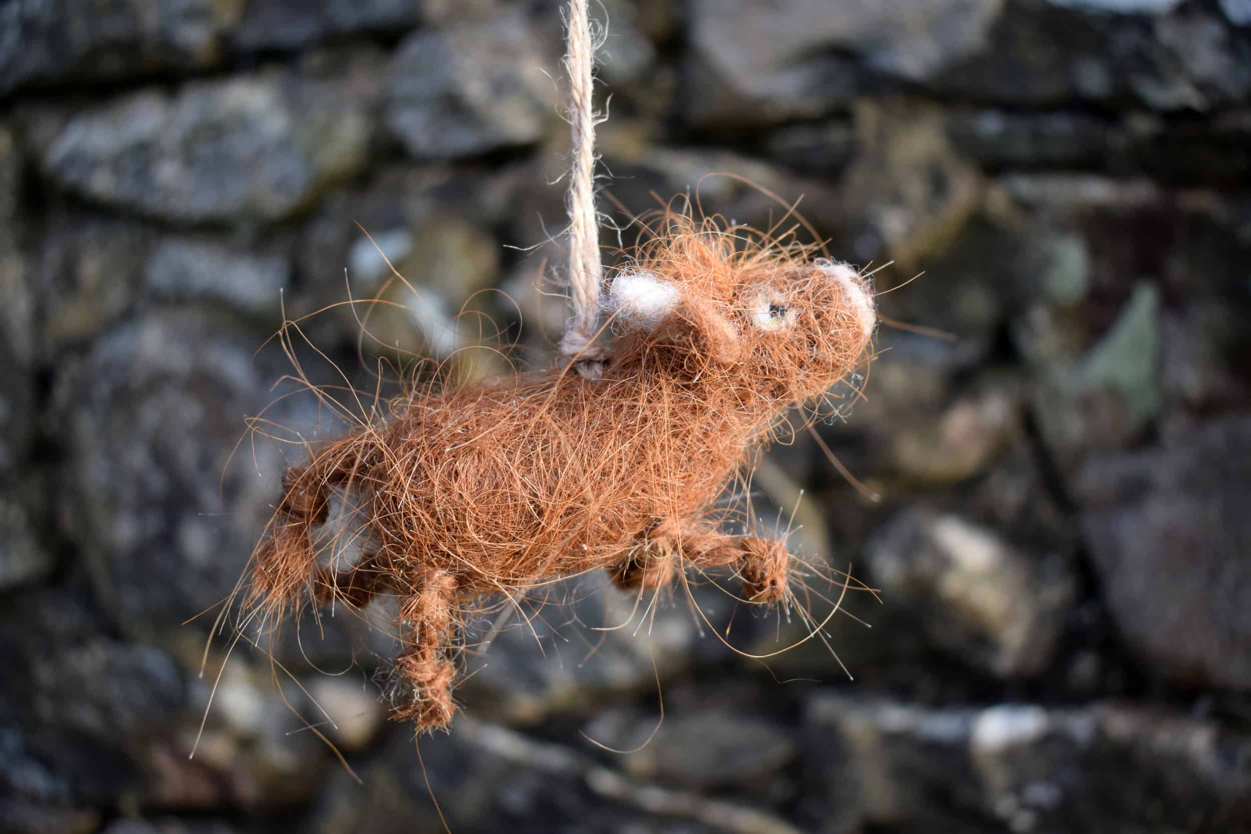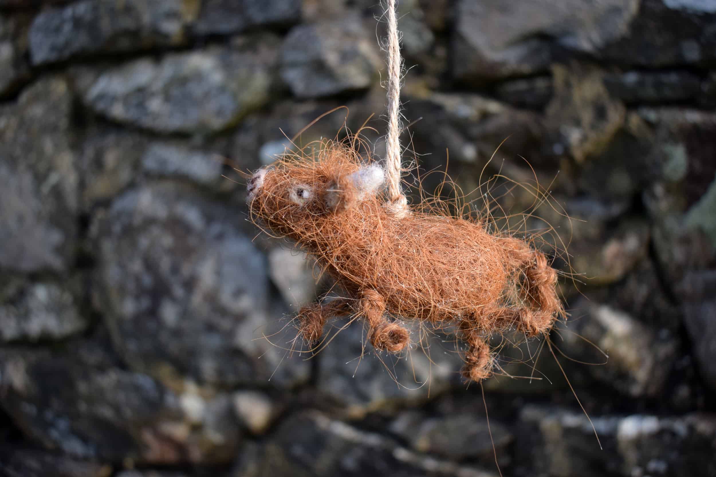 This cute little needle felted Highland cow is made from 100% wool and real natural ginger Highland cow hair handcrafted from sheep (and cow) to finish. Her eyes are pure wool and her tail and legs are made from carefully handspun Highland cow hair (which is not the easiest thing to spin I can tell you!) – she is made entirely at our farm by my own hands. The perfect unique addition to any cow lover’s home she looks very sweet hanging from a shelf especially in a cottage or farmhouse setting and would make a lovely special gift. Completely natural, biodegradable, kind to sheep (and cow) and the planet. She is made with a little bit of wool from our sheep mixed with and some very hairy Highland cow hair from a pet cow who lives on Anglesey. The main part of her body is a mix of said ginger Highland cow hair and a little beige brown wool from Marmalade. The Highland hair was gifted to me from Ema at The Clean Goat Soap Company. You can read a little more about it further below.