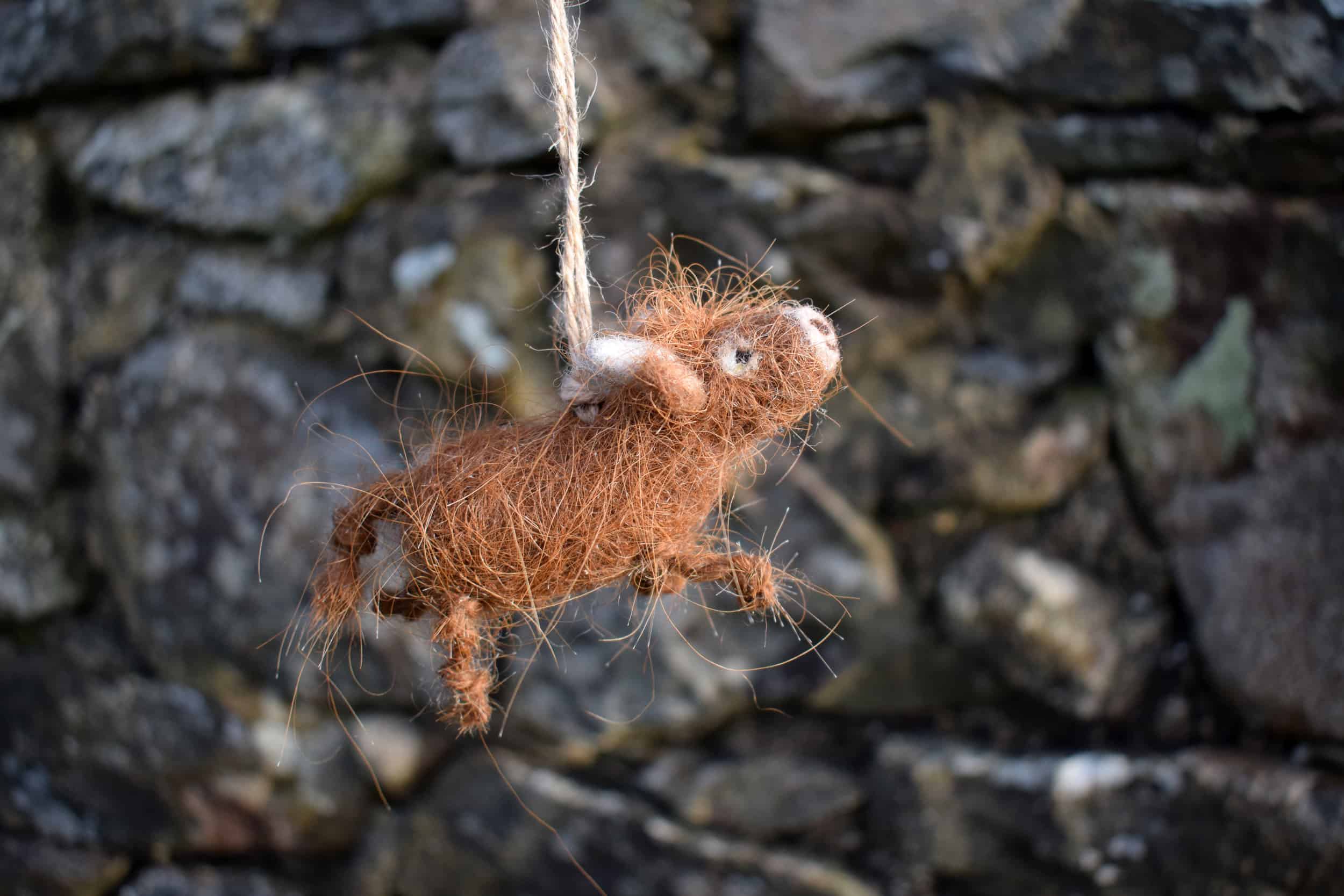 The inspiration for the needle felted hanging cows came from being gifted a bag of real hairy Highland cow hair from some friends (Ema and Steve) who own The Clean Goat Soap Company. Ema’s dad lives on Anglesey and owns two Highland Cows who he brushes regularly. Ema heard that I was curious about felting with Highland cow hair and kindly sent me a bag of her dad’s pet Highland cow’s hair! Which is the actual hair I have used to make some of the needle felted cows. I have always had a soft spot for cows and in fact, I once owned 3 dairy calves who I hand-reared. They were a Jersey, a Brown Swiss cross Jersey and a Friesian cross Jersey. Unfortunately, as they grew rather large I realised reluctantly that I couldn’t keep them long-term so I had to let them go to join a herd but I have very fond memories of them.