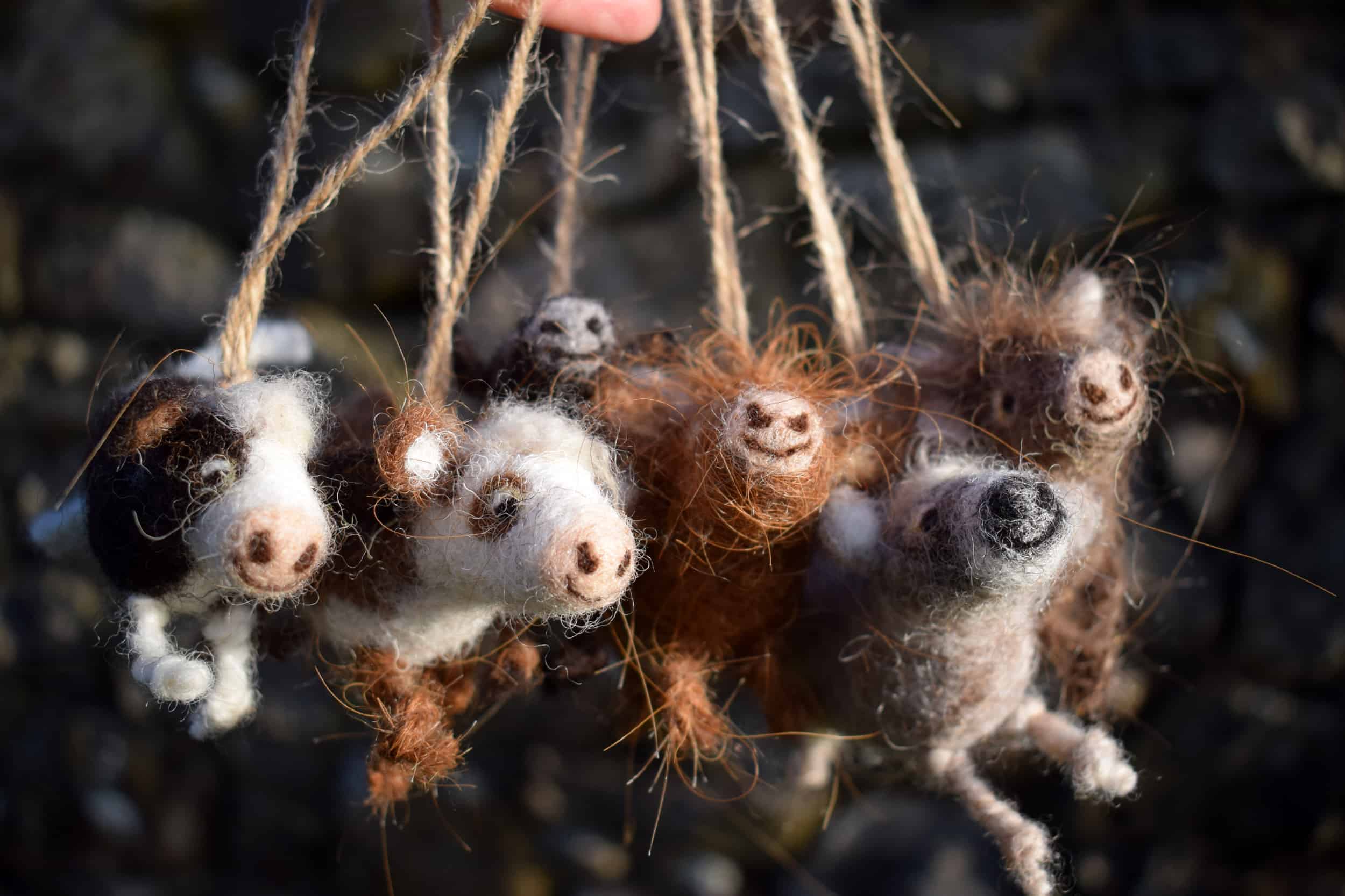 The inspiration for the needle felted hanging cows came from being gifted a bag of real hairy Highland cow hair from some friends (Ema and Steve) who own The Clean Goat Soap Company. Ema’s dad lives on Anglesey and owns two Highland Cows who he brushes regularly. Ema hear that I was curious about felting with Highland cow hair and kindly sent me a bag of her dad’s pet Highland cow’s hair! Which is the actual hair I have used to make some of the needle felted cows. I have always had a soft spot for cows and in fact, I once owned 3 dairy calves who I hand-reared. They were a Jersey, a Brown Swiss cross Jersey and a Friesian cross Jersey. Unfortunately, as they grew rather large I realised reluctantly that I couldn’t keep them long-term so I had to let them go to join a herd but I have very fond memories of them.